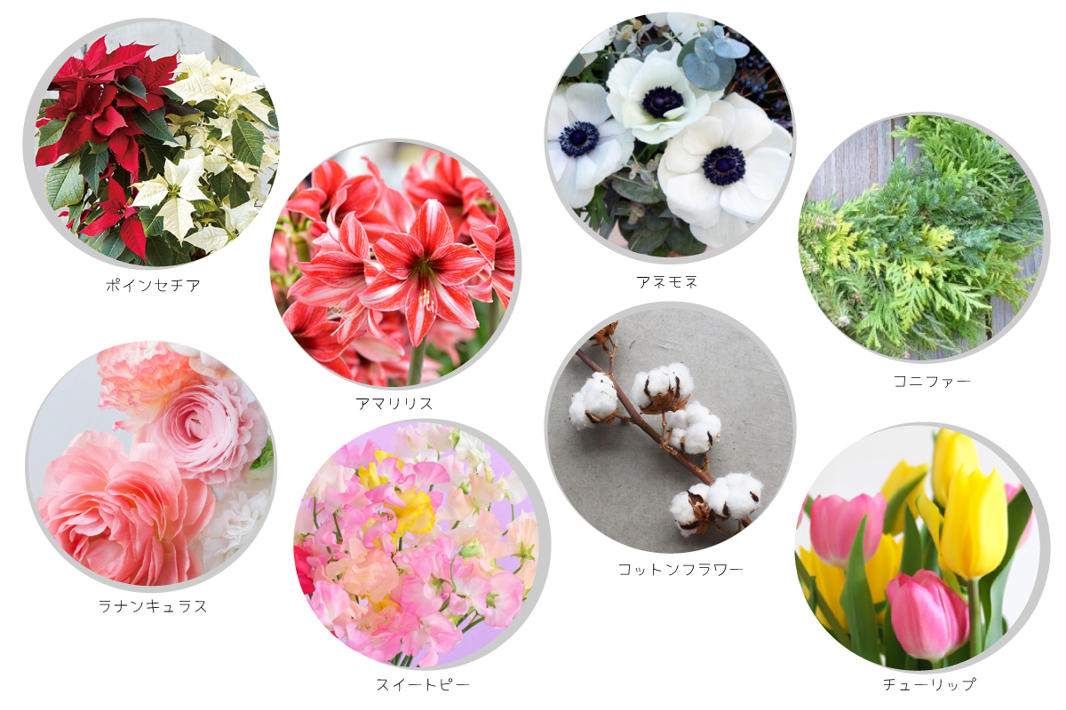 意外と思われる方もいらっしゃるかもしれませんが、実は切り花の世界では花材の種類が豊富になるのは秋冬シーズン。アネモネ、ラナンキュラス、チューリップなど春の花材は、冬の時季から流通が始まるためブーケに使うことも◎